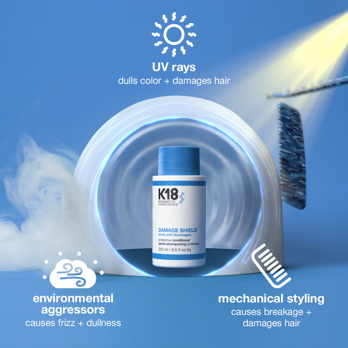 Damage happens every day from UV rays, mechanical styling, and environmental aggressors—weakening, dulling, and causing frizz on all hair types.